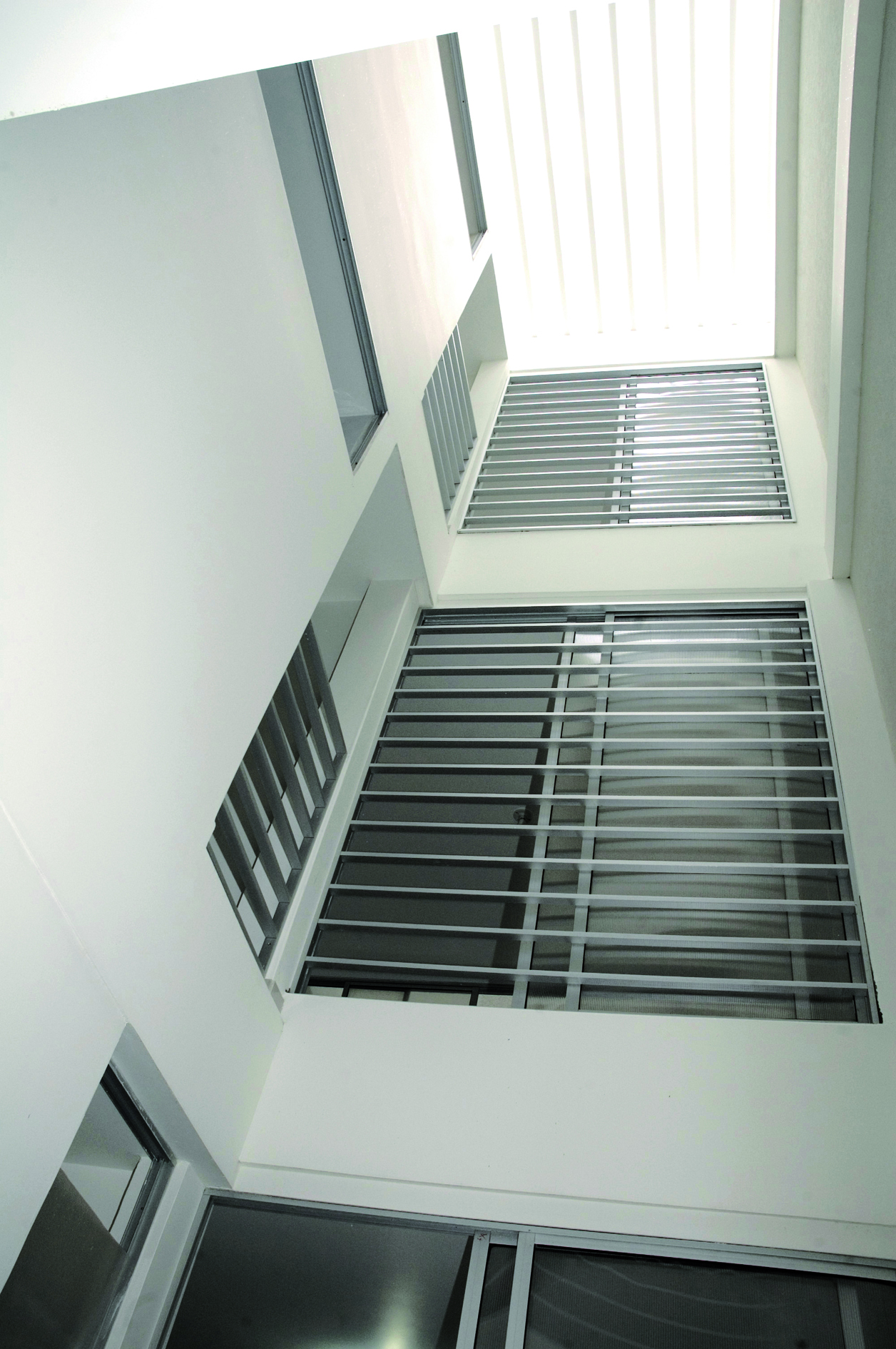 The second idea is a pair of courtyard lightwells that organise the house around light, air and vegetation. Open to the tropical Colombian climate, these courtyards draw daylight deep into the plan while enabling passive cooling and natural cross-ventilation.